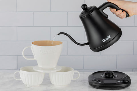 Dualit의 전기 푸어 오버 주전자는 커피 메이커를 통한 드립과 함께 사용하거나 정확한 브로잉 온도가 필요할 때 이상적입니다. 정밀한 추출구를 사용하면 물의 흐름이 더욱 고르게 흘러 커피를 일정하고 느리게 추출할 수 있습니다.