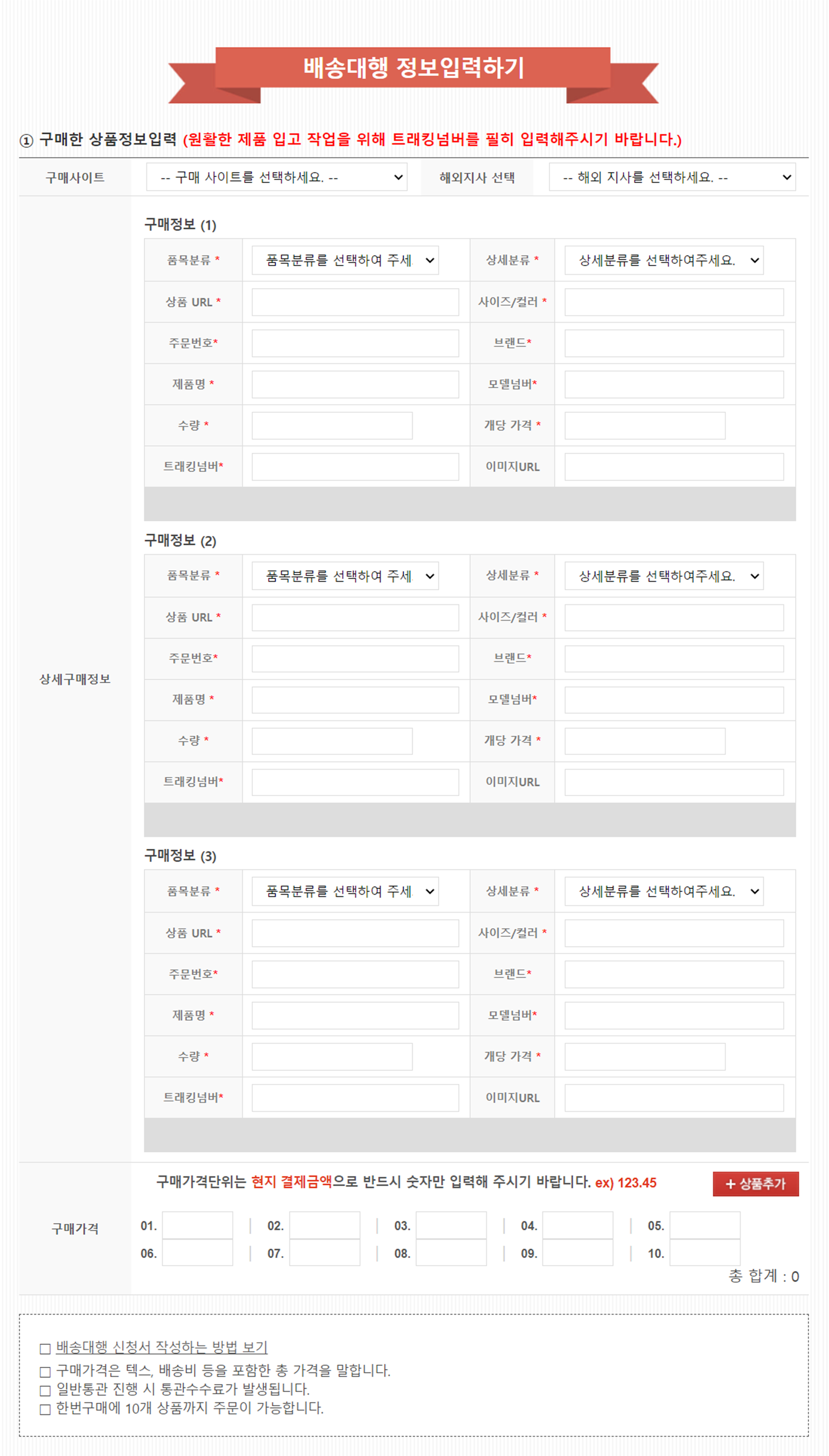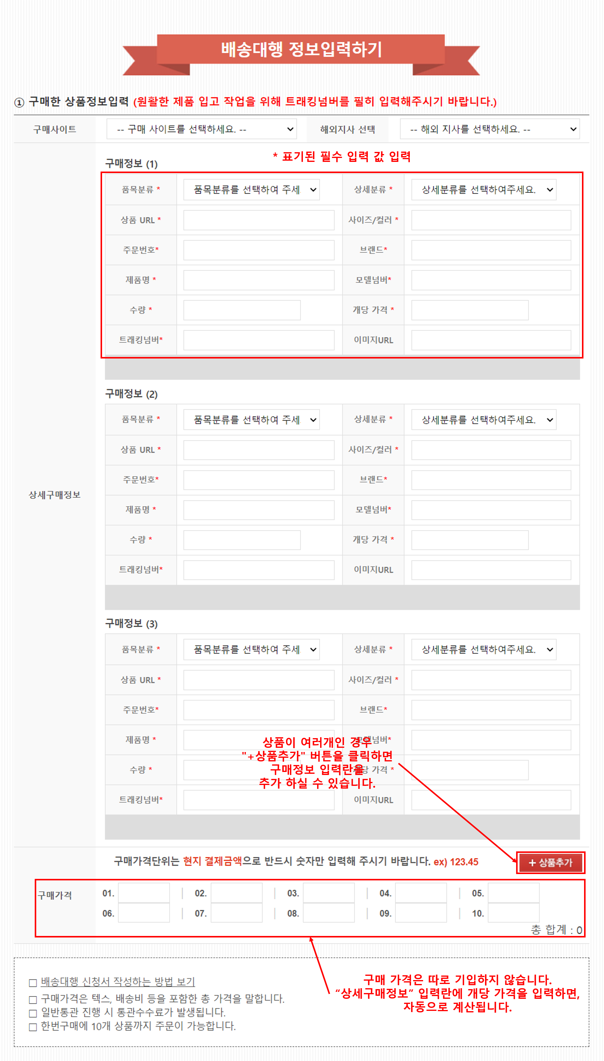 ☞ 배송대행요청해야 하는 상품이 많은 경우 하단의 "+상품추가" 버튼을 클릭하여 상품을 정보를 입력하시면 됩니다.