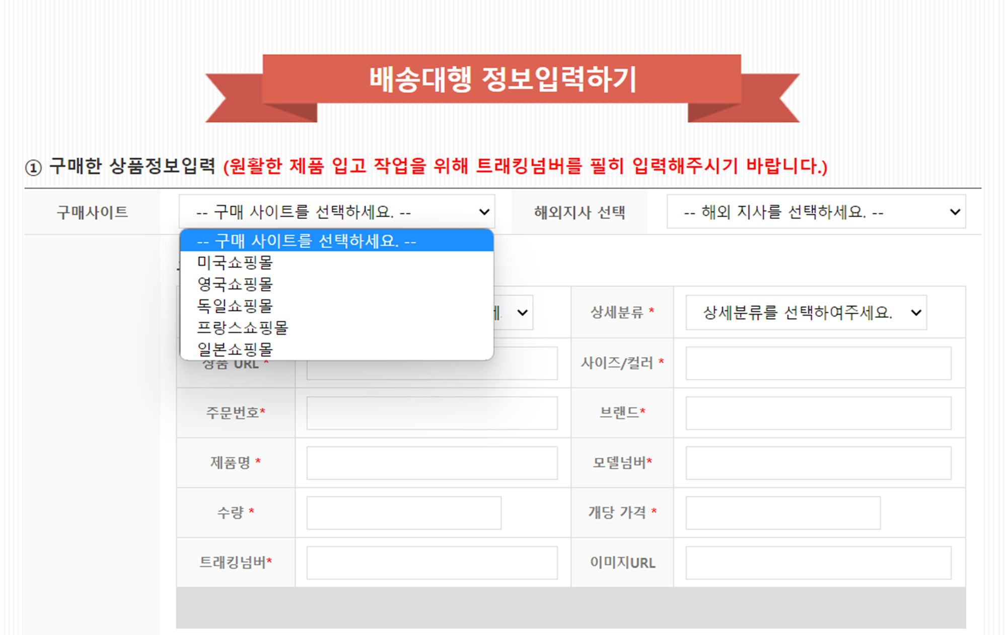 고객님께서 배송대행신청하실 상품에 해당하는 메뉴를 선택해 주시면 됩니다.