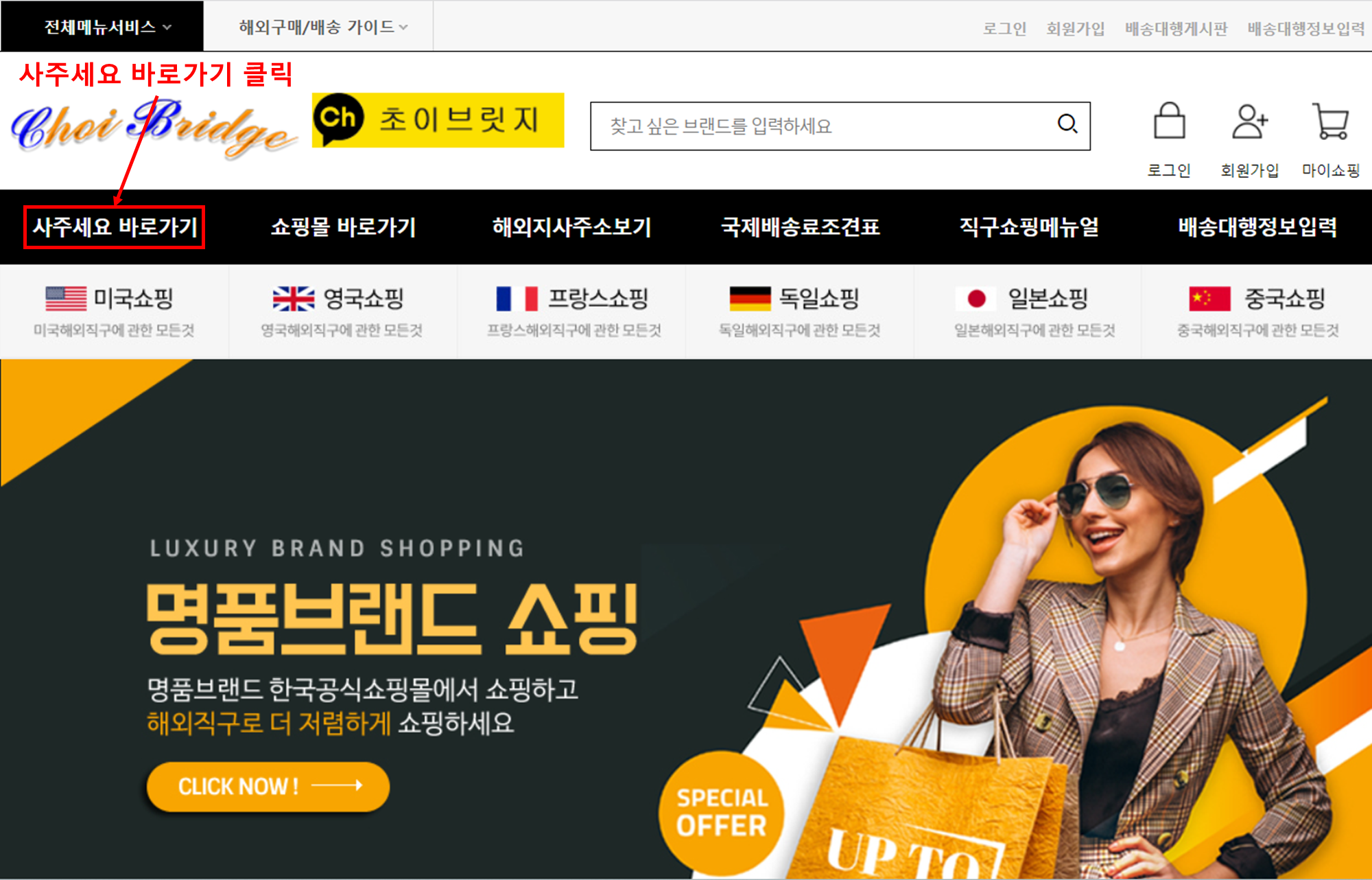1. "초이브릿지" 홈페이지 중간에 있는 "사주세요 바로가기"를 클릭한다.